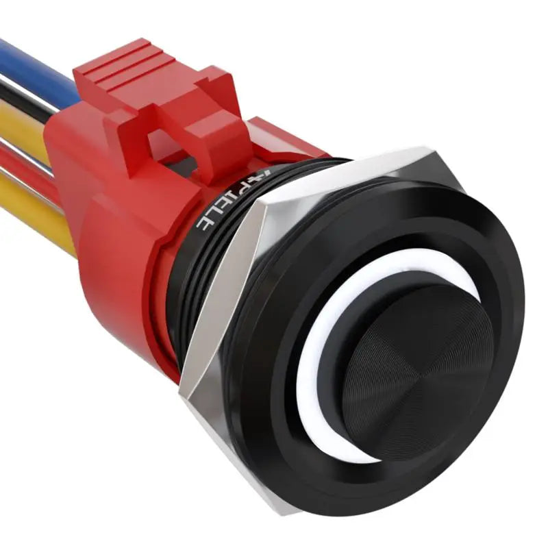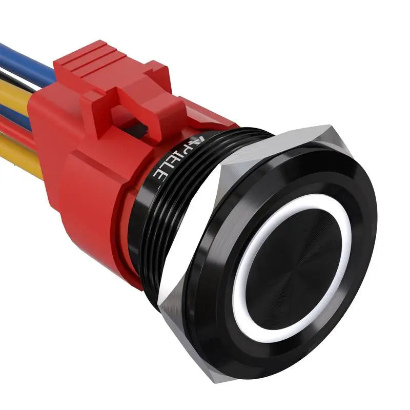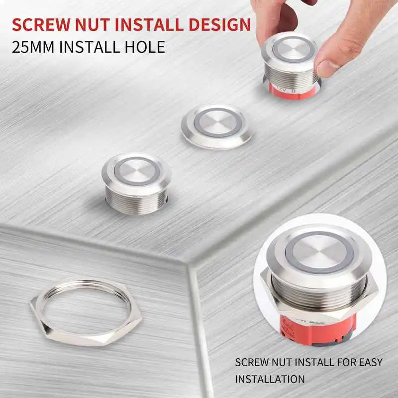 This silver stainless-steel push-button switch has an LED ring pattern at the top for unmatched smoothness. The LED ring pattern comes in red, green, blue, white, and yellow patterns, while the 1 to 10 mm panel thickness makes this device rather versatile.